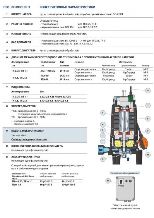 Дренажный электронасос с режущим механизмом Pedrollo TRITUS TR1.1 1,1 kW