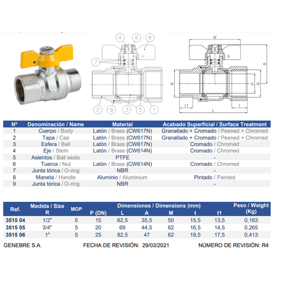Шаровый кран для газа бабочка 3/4" FM (хром) Genebre