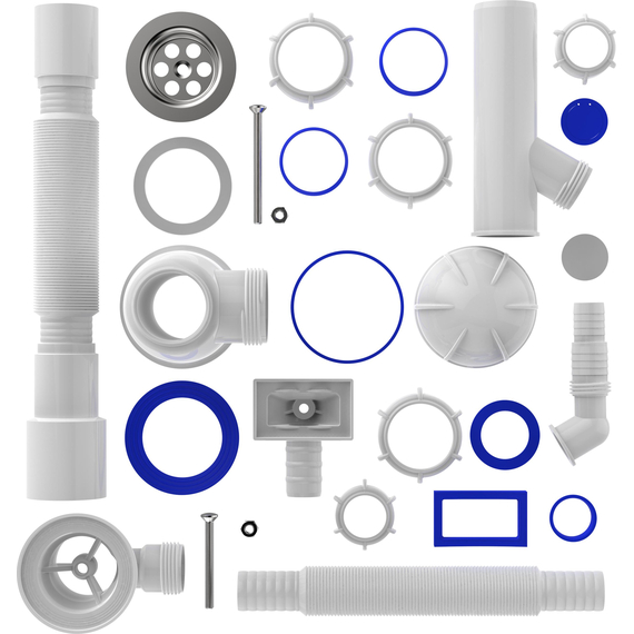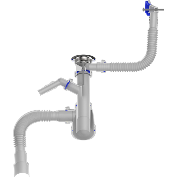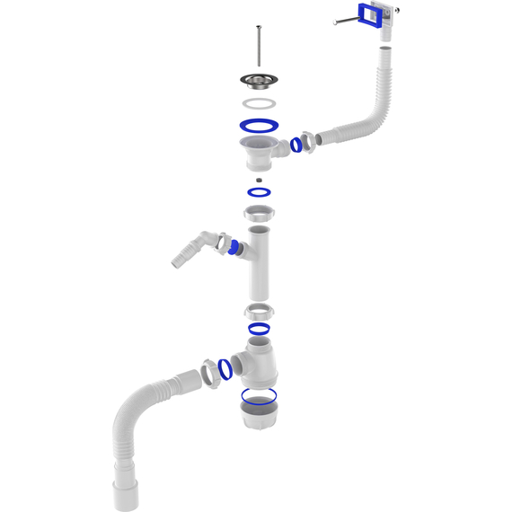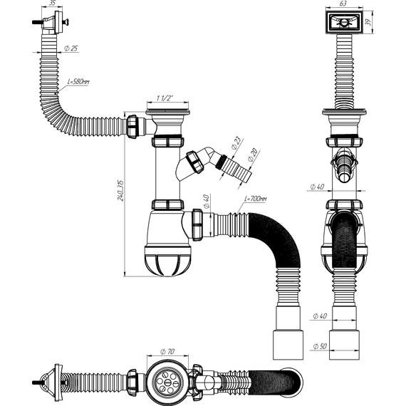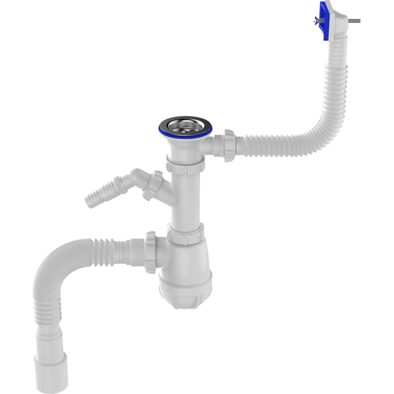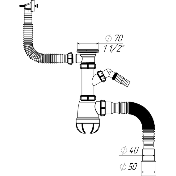 Сифон для кухни 1 1/2" х 40 с отводом для стир машины и переливом с гибкой трубой 40х40/50, Aquant