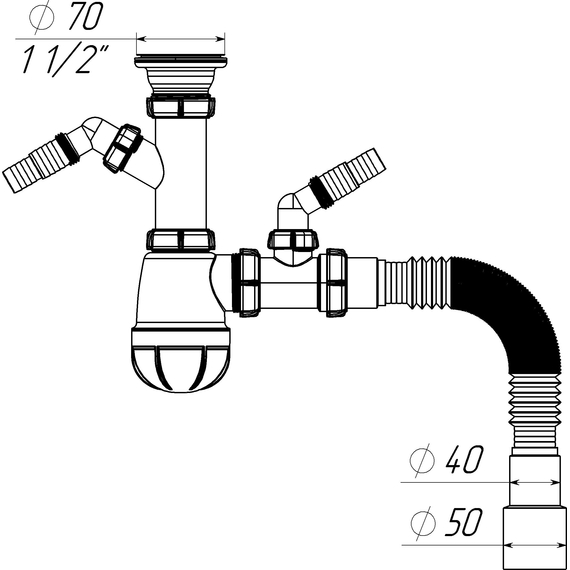 Сифон для кухни 1 1/2"х40 с двумя отводами с/м с г.т. 40х40/50, Aquant