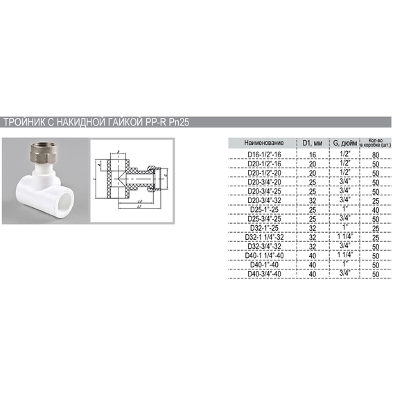 Тройник с накидной гайкой д.20 x 1/2'' x 20 PN25 РВК (50)
